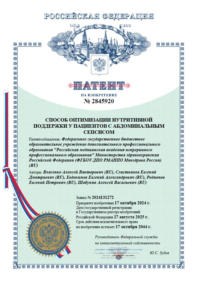 Сотрудники кафедры анестезиологии, реаниматологии и неотложной медицины ФГБОУ ДПО РМАНПО Минздрава России и врачи—анестезиологи-реаниматологи ГБУЗ ММНКЦ им. С.П. Боткина под руководством заведующего кафедрой и отделением реанимации № 32 ЦАР профессора А.В. Власенко активно и успешно работают в этом научно-практическом направлении. Результатом данной работы стало получение командой патента на изобретение № 2845920 «СПОСОБ ОПТИМИЗАЦИИ НУТРИТИВНОЙ ПОДДЕРЖКИ У ПАЦИЕНТОВ С АБДОМИНАЛЬНЫМ СЕПСИСОМ».