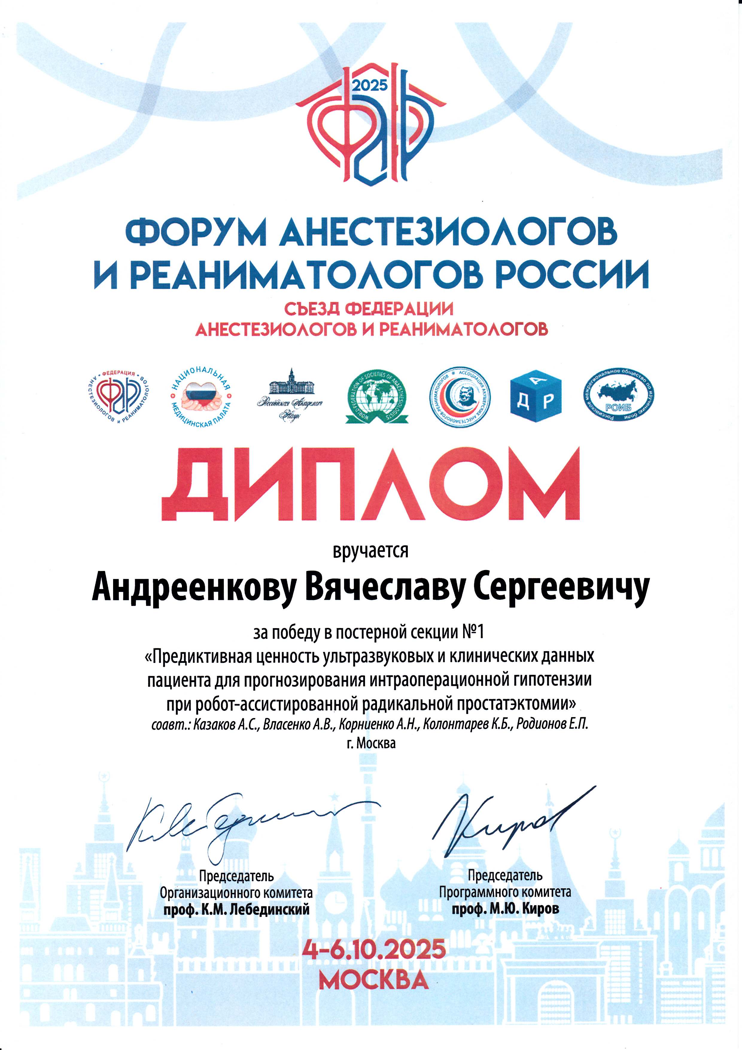 С большой гордостью следует отметить, что по итогам докладов на постерных сессиях форума первое место занял доклад ассистента кафедры анестезиологии, реаниматологии и неотложной медицины ФГБОУ ДПО РМАНПО Минздрава России, врача-анестезиолога-реаниматолога отделения анестезиологии-реанимации № 79 ЦАР ММНКЦ им. С.П. Боткина Вячеслава Сергеевича Андреенкова на тему: «Предиктивная ценность ультразвуковых и клинических данных пациента для прогнозирования интраоперационной гипотензии при робот-ассистированной радикальной простатэктомии».