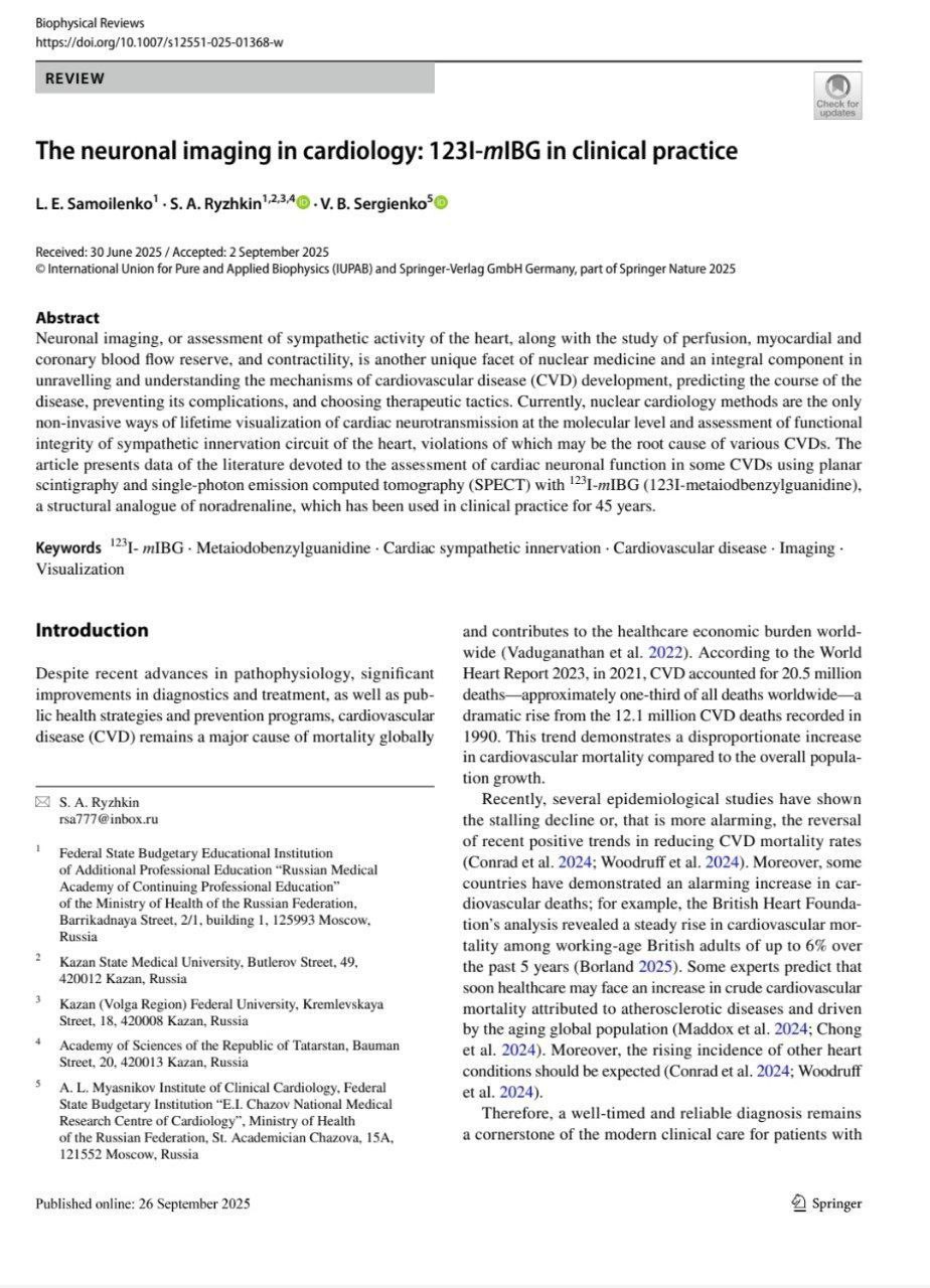 Заведующий кафедрой радиологии, радиотерапии, радиационной гигиены и радиационной безопасности имени академиков А.С. Павлова и Ф.Г. Кроткова ФГБОУ ДПО РМАНПО Минздрава России д.м.н., член-корреспондент АН РТ Сергей Александрович Рыжкин вместе с профессором кафедры д.м.н. Людмилой Евгеньевной Самойленко и руководителем отдела радионуклидной диагностики и позитронно-эмиссионной томографии НМИЦ кардиологии имени академика Е.И. Чазова Минздрава России д.м.н., профессором, лауреатом премии Совета Министров СССР Владимиром Борисовичем Сергиенко опубликовали обзор «Нейронная визуализация в кардиологии: 123I-МИБГ в клинической практике» в научном журнале Biophysical Reviews (WoS, Scopus, Q1).