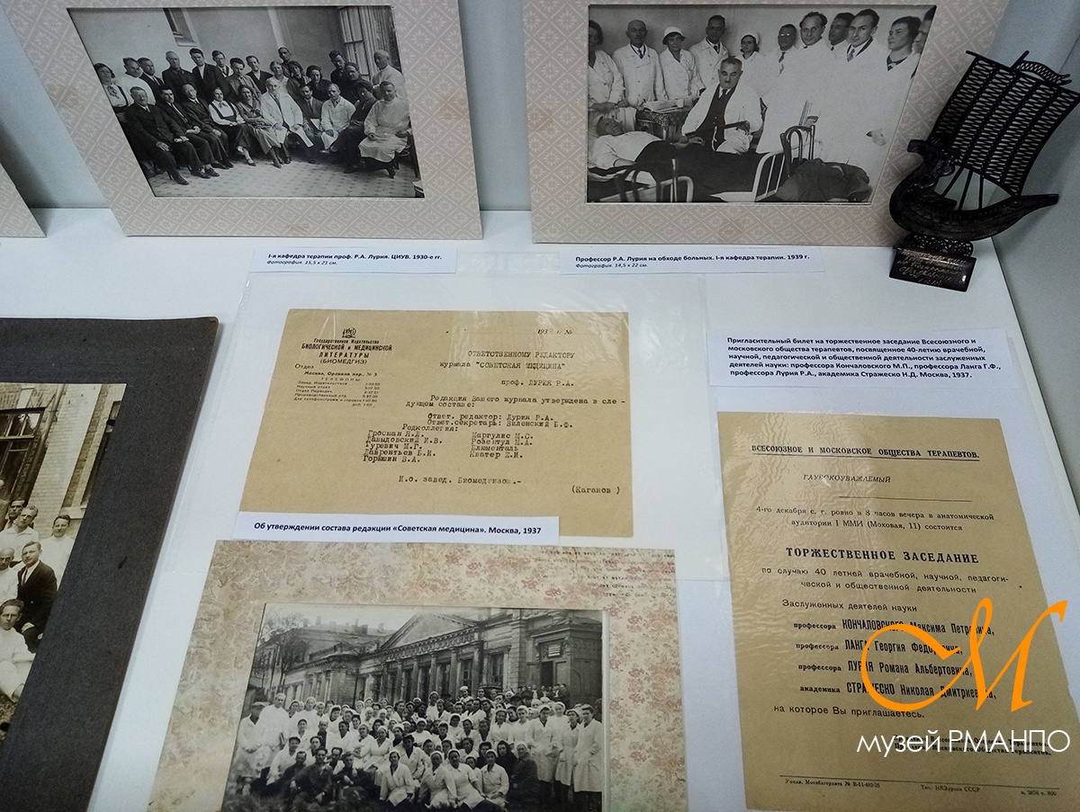 Отдельные витрины музея рассказывают об истории первых кафедр – в них представлены редкие фотографии 1930-х годов, портреты основателей кафедр, оттиски статей, книги с автографами, грамоты, удостоверения и справки, выданные в середине 1930-х годов. Среди наиболее интересных экспонатов: листовка с расписанием цикла лекций в Большом Новинском переулке, 12 (где в начале 1930-х годов располагался Центральный институт усовершенствования врачей), корешок разового пропуска для входа в здание на Баррикадной улице, удостоверение курсанта, прошедшего подготовку в первом выпуске, а также уникальная фотография первой группы выпуска с адресами и автографами курсантов на обороте.